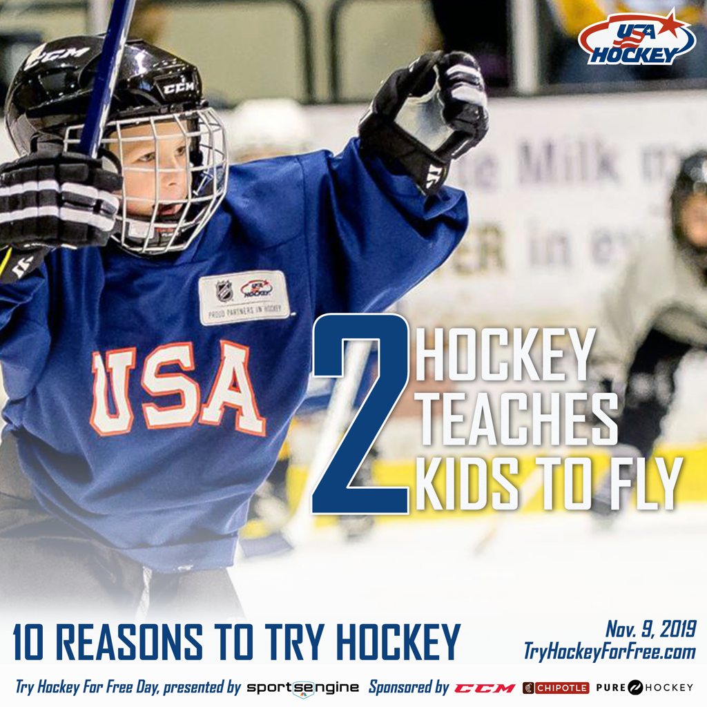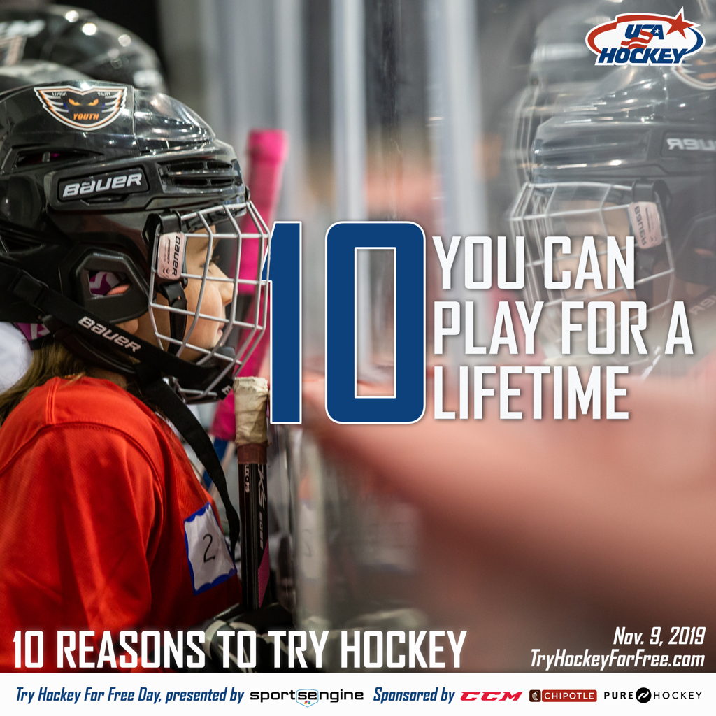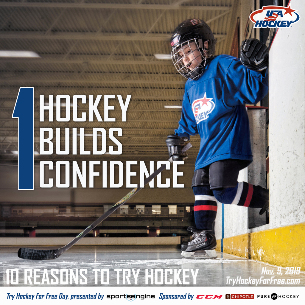 Join Hockey! Top 10 Reasons: Hockey Builds Confidence, Hockey Teaches Kids to Fly, Hockey Builds Mental Agility, Hockey Rinks are Warmer than you Think!, Hockey Teaches Persistence, Hockey is for Everyone, Hockey Develops Social Skills, Screening the Goalie is Better than Screen Time, Hockey Teaches Increased Physical Literacy, You Can Play Hockey for a Lifetime