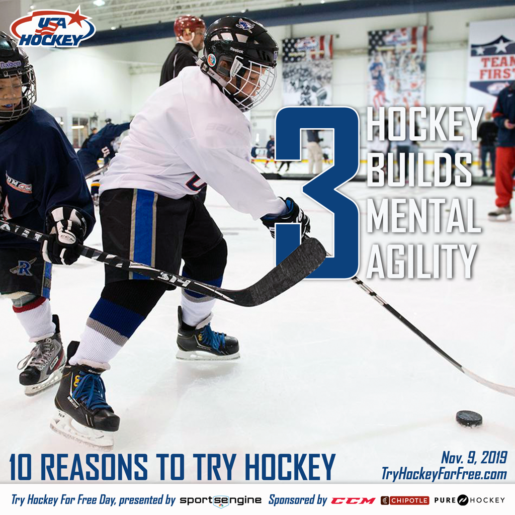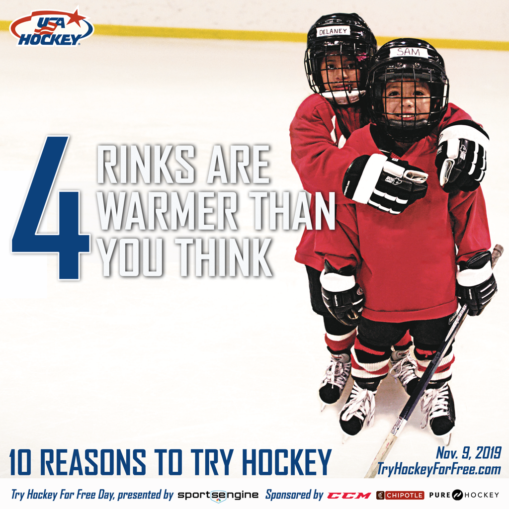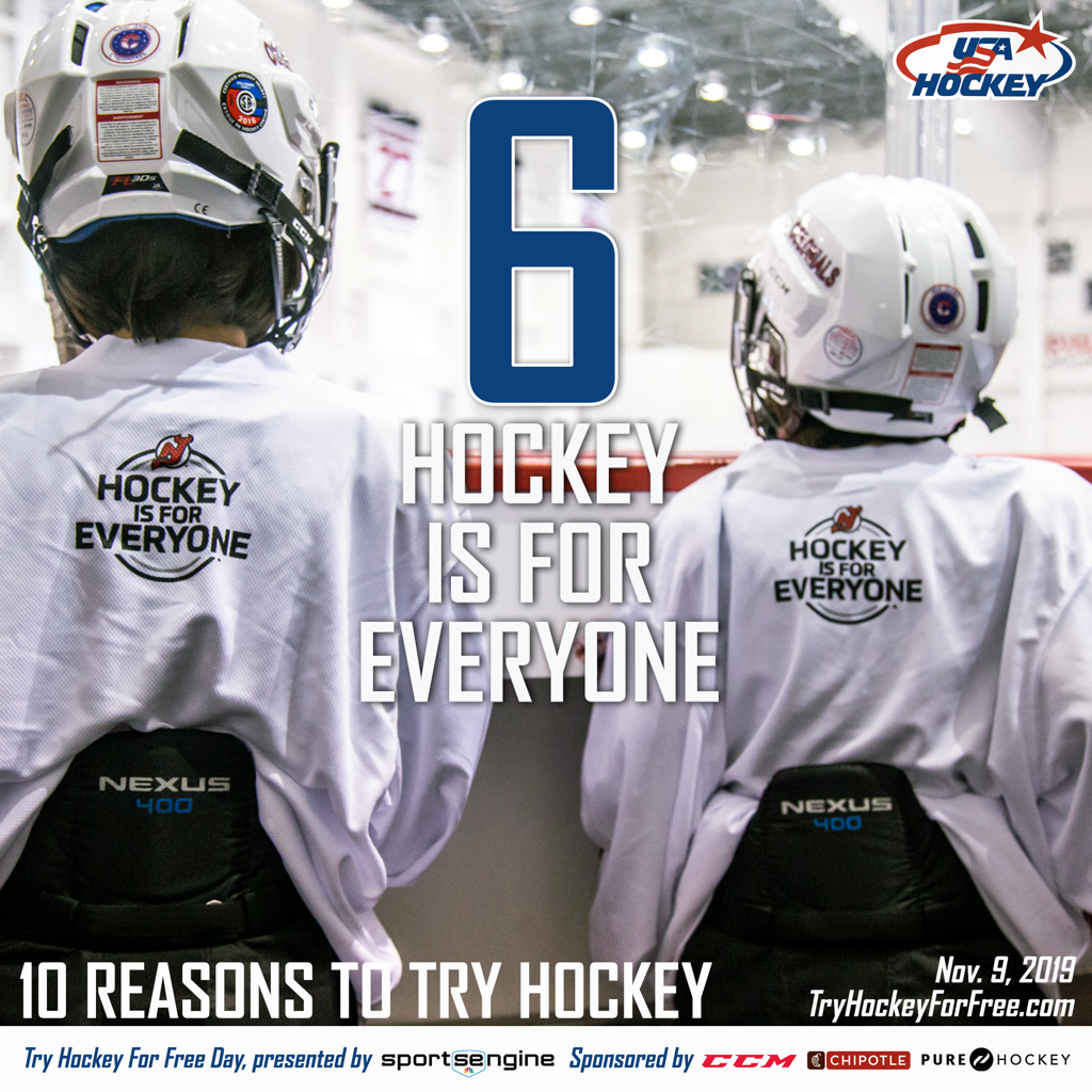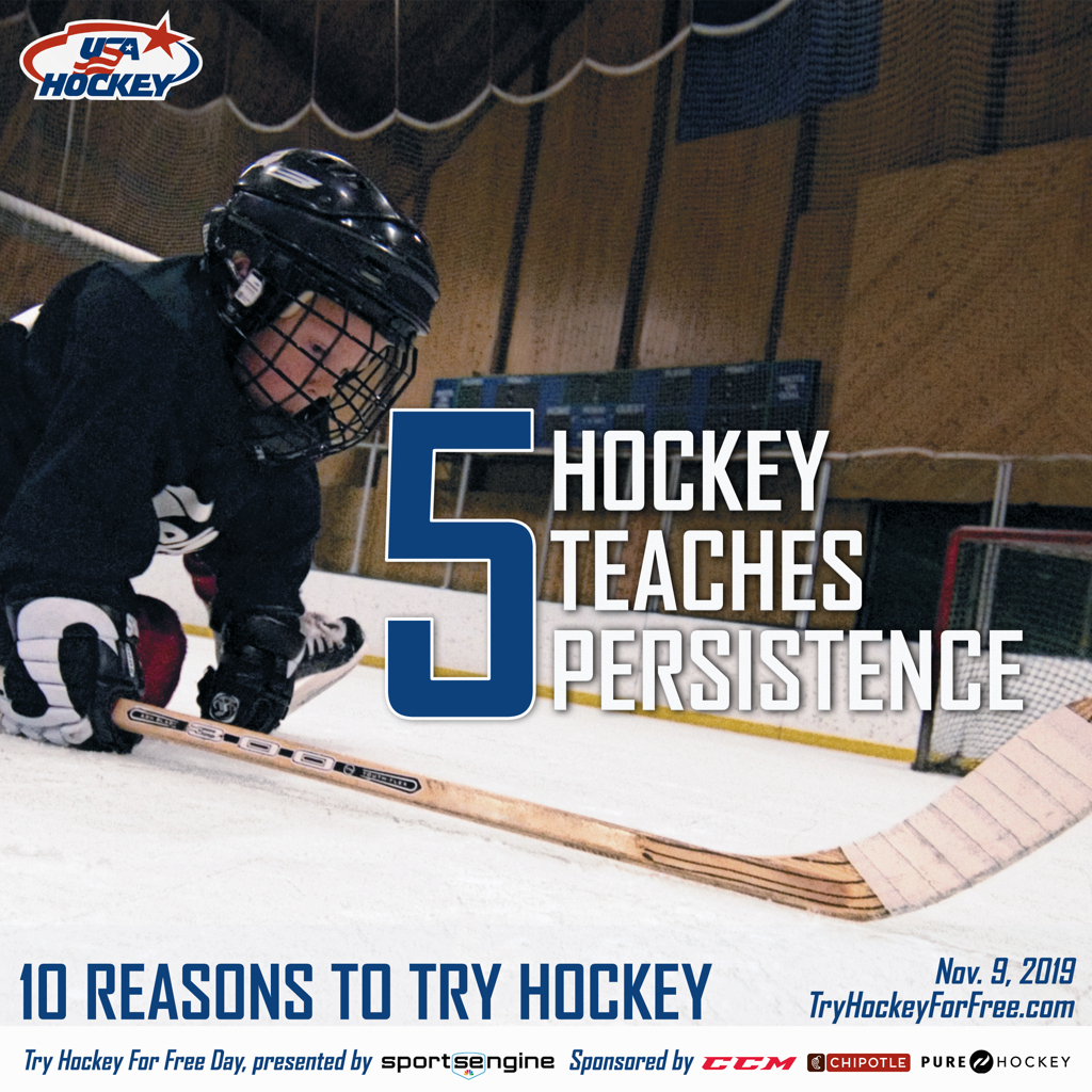 Join Hockey! Top 10 Reasons: Hockey Builds Confidence, Hockey Teaches Kids to Fly, Hockey Builds Mental Agility, Hockey Rinks are Warmer than you Think!, Hockey Teaches Persistence, Hockey is for Everyone, Hockey Develops Social Skills, Screening the Goalie is Better than Screen Time, Hockey Teaches Increased Physical Literacy, You Can Play Hockey for a Lifetime