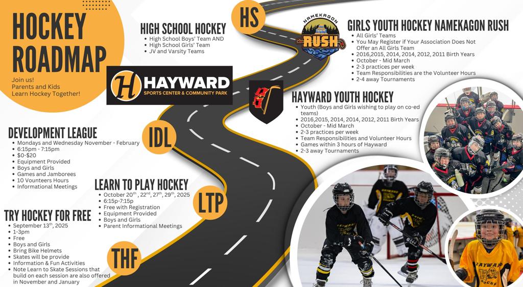 Hayward Youth Hockey and the Namekagon Rush Girls Youth Hockey programs are committed to providing great team athletic experience to our youth through affordability, quality coaching, accessible facilities and training opportunities! The Mission of Hayward Hockey is to foster competitive, hardworking and respectful athletes who are committed to success.